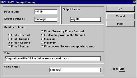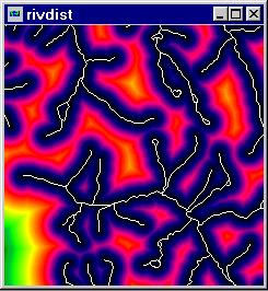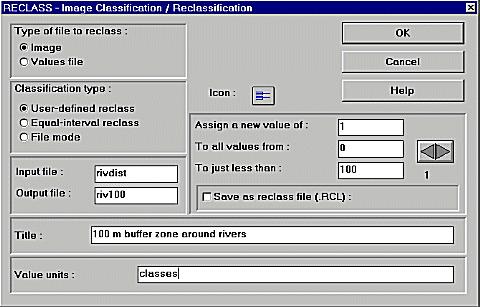 By applying RECLASS to the output image of DISTANCE (rivdist) we extract a 100 m buffer zone around the rivers: distance values between 0 and 100 are set to 1, all others to 0. The output image (here named riv100) contains only 1 and 0, 'yes' and 'no', therefor call it a boolean image