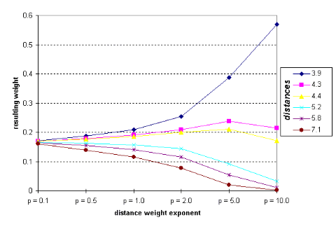 These are just six random choosen sample distance values. They indicate the distance from the point to be estimated to the next six known value points in ascending order (the weights have been standardized). Note how the weights of the different distances diverge with