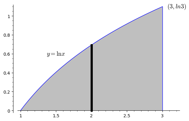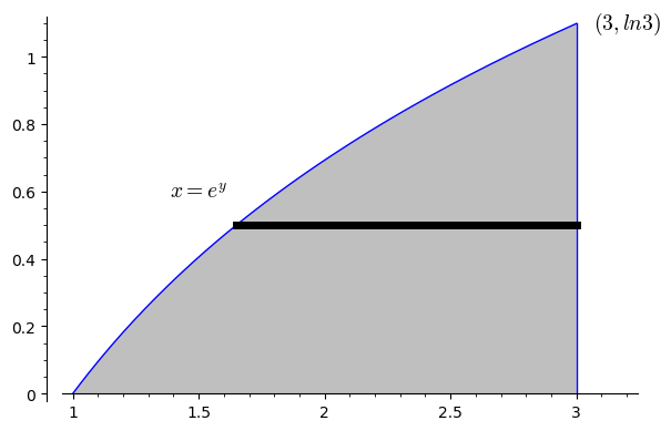 ดังนั้น $ \int_1^3 \int_0^{\ln x } f(x,y)dydx \qquad = \int_0^{\ln 3} \int_{e^y}^3 f(x,y) dxdy $